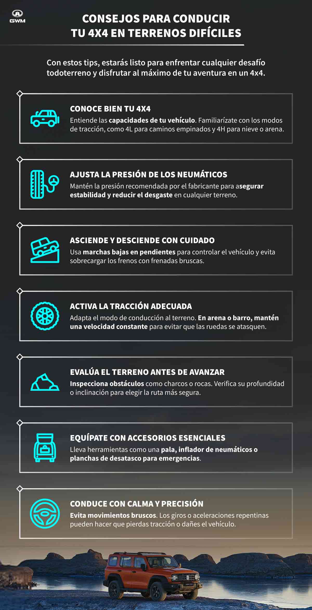 Como se mencionó, conducir un auto 4x4 en terrenos desafiantes puede ser emocionante, pero requiere preparación y técnica.