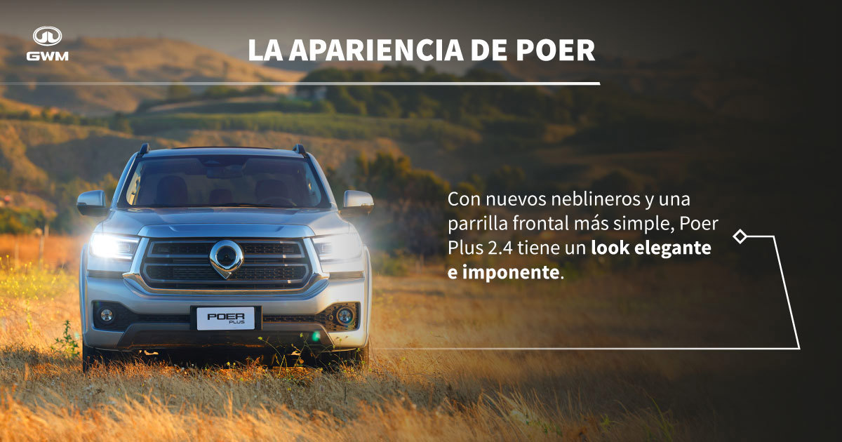 Si bien sus cambios estéticos no son tan notorios, aportan un toque de frescura y sofisticación a su robusta apariencia. Por ejemplo, integra nuevos neblineros, una parrilla frontal más simple, llantas de aleación rediseñadas y una zaga con el logo GWM. En su habitáculo, destaca la presencia de un nuevo panel de instrumentos digital, sistema de infoentretenimiento con pantalla más grande (12,3”) y un volante rediseñado con el logo Poer.