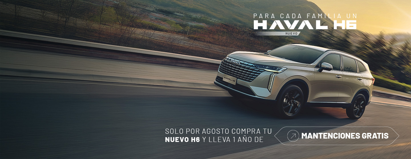 1) Precios publicados incluyen IVA, bono marca y bono financiamiento. Bono financiamiento aplica solo a ventas con financiamiento intermediado por Amicar, pactado con un pie máximo de 40% y un mínimo de 24 cuotas. Crédito sujeto a aprobación de antecedentes comerciales del solicitante por la institución financiera otorgante del crédito. Precios y bonos válidos desde el 1 al 31 de Agosto de 2025, ambas fechas inclusive. No acumulable con otras promociones. Más información consulte a su ejecutivo Dercocenter en punto de venta. Precios no incluyen flete. Promoción excluyen Zona Franca. (2) Bono financiamiento no operan respecto del producto financiero denominado ”Revaluación Plus”. Para verificar los atributos y especificaciones técnicas del modelo tenemos un completo equipo de especialistas para asistir el proceso de compra en cualquiera de nuestros puntos de ventas a lo largo del país. (3) Consumo H6 versiones Elite y Deluxe Ciudad: 9,6 km/L - Mixto: 11,9 km/L - Carretera: 13,9 km/L vehicular obtenido en mediciones de laboratorio según el ciclo de ensayo de la Comunidad Europea, homologadas en el MTT, más información en www.consumovehicular.cl.(4) Promoción mantención de 1 año gratis válido para compras del nuevo H6 realizadas en el mes de Julio, mantenciones deben ser las que aplican según póliza / manual de usuarios y en red Dercocenter.