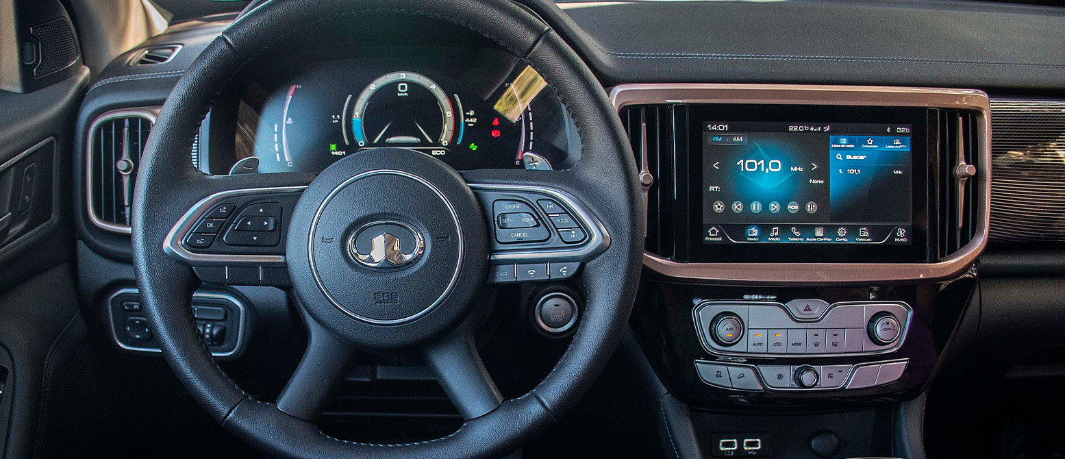 El refinado ecocuero de la camioneta doble cabina POER PLUS brinda un toque de lujo a tu conducción, priorizando el estilo y la responsabilidad ambiental en cada viaje.
